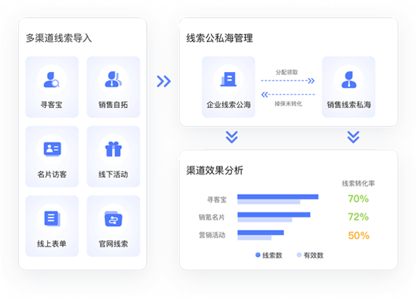 聚合尋客寶、名片、官網注冊、市場推廣、銷售自拓等多渠道線索,實現對線索的統一管理